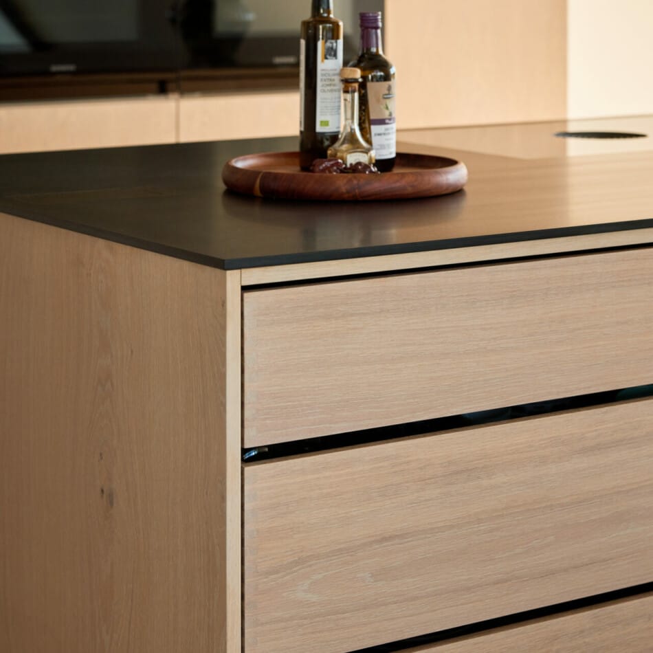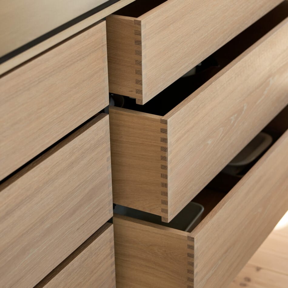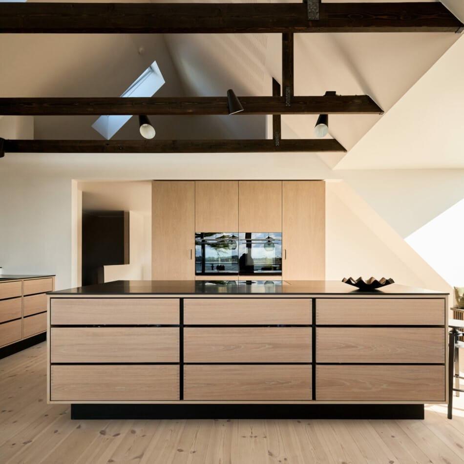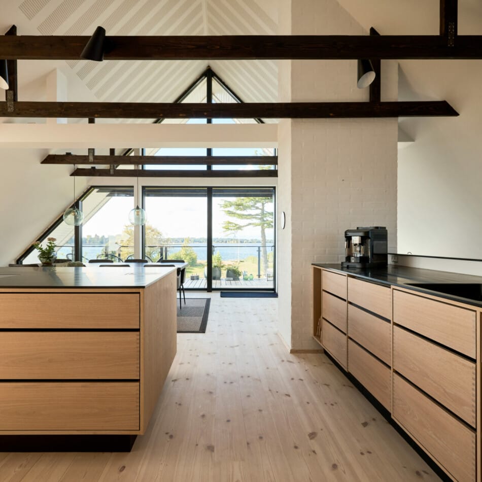 Vi er meget stolte af at have leveret dette smukke køkken til en kunde ved Præstø Fjord. Køkkenet er udført i egetræ med let hvidpigmenteret olie. Skuffer med tappede samlinger.